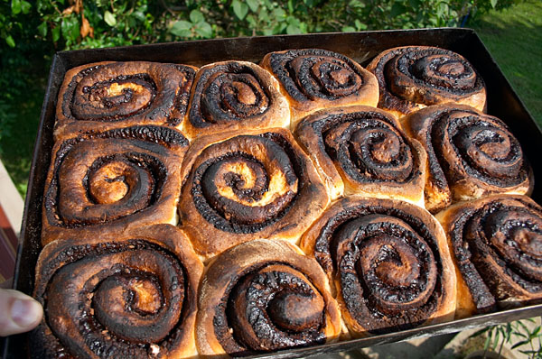 Amikor megkelt a tészta, lisztezett gyúródeszkán 1-1,5 cm vastagságúra nyújtjuk. Teavajat megolvasztjuk, majd megkenjük vele a tésztát. A kakaót összekeverjük a porcukorral, majd vastagon megszórjuk. A tésztát feltekerjük, majd 2 cm-es vastagságú szeletekre vágjuk. Tepsübe sütõpapírra (vagy vajjal kikent) helyezzük egymástól kb. 1 cm távolságra, majd olvasztott vajjal megkenjük a tetejét.