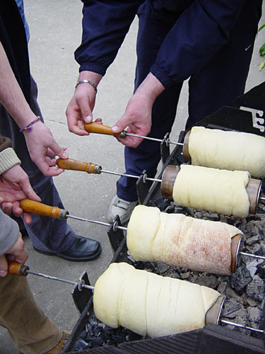 A tésztát jól kidolgozzuk és kelni hagyjuk. Amikor félig megkelt, szeleteket vágunk, kisujjnyi vastagságúra sodorjuk és az előre elkészített sütőfára egymás mellé spirálisan rácsavarjuk. A tekerés végén a tésztát az utolsó menet alá visszatűrjük nehogy a sütéskor letekeredjen a fáról. A sütőfát előtte olvasztott vajjal kenjük, hogy sütés után könnyen leválljon róla a tészta. Ízlés szerint normál kristálycukorba vagy vanílias kristálycukorba hengerítjük amíg a teljes felülete cukros nem lesz. Ez képezi majd a csodálatos karamell bevonatot a sütés végére. Faszén parázs felett forgatjuk amíg a cukor gyönyörű karamell színű nem lesz. Addigra a tészta is megsül. Aztán már csak az ízesítés van hátra a legnagyobb gyönyör, az evés előtt. Ízlés szerint fahéjas, kakaós, garált diós porcukorral szórjuk. Egyébként minden további ízesítés nélkül is fogyaszthatjuk, így is garantáltan nagyon finom és nem mindennapi süteményt kapunk családunk és barátaink legnagyobb megelégedésére!