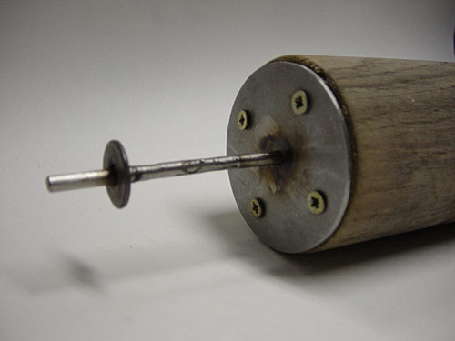 Egyszerre 4 db kalácsot tudunk sütni egy átlag öntöttvas grillsütőn. Esztergáltam 2db sütőfát diófából és 2db-ot cseresznyéből. A dió sokkal jobb, mert a cseresznye tudvalevő, hogy spirálisan megreped. Ez egy ilyen fa. A két vége természetesen nem azonos átmérőjű, hogy a sütés végén a kalácsot le tudjuk csúsztatni a sütőfáról. A grillsütőre popszegecseltem 4 db alumínium támasztékot, a hátsó lemezen pedig fúrtam pár furatot amibe a sütőfa fém vége illeszkedik.