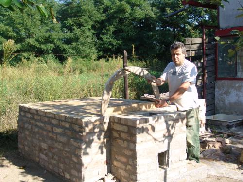 A közelben volt egy hely, ahonnan agyagot lehetett bányászni. Hoztam néhány vödörrel. Az agyagot sóval és vízzel kevertem össze tejföl sûrûségûre. A sütõteret sós agyagba rakott kisméretû téglákból alakítottam ki, és lerakás után szintén agyaggal fugáztam a téglák közötti réseket.